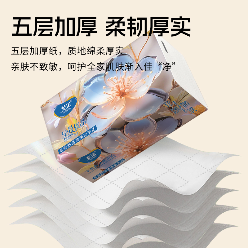 柔诺有印花无添加成分抽纸抽取式纸巾可湿水面巾纸五层加厚抽纸