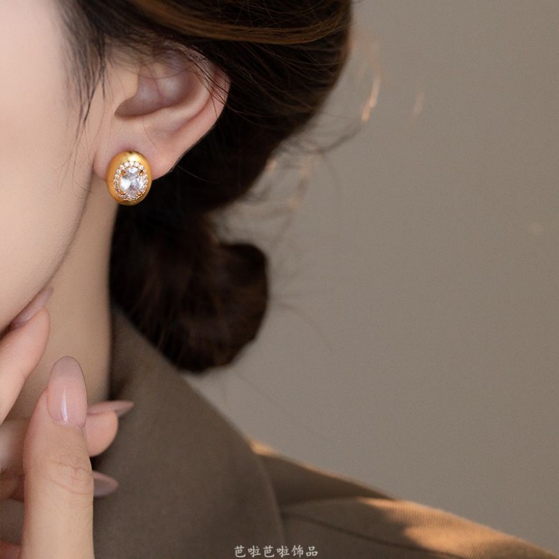 中古金色拉丝金属锆石耳钉女耳夹小众轻奢气质时尚高级鸽子蛋耳环