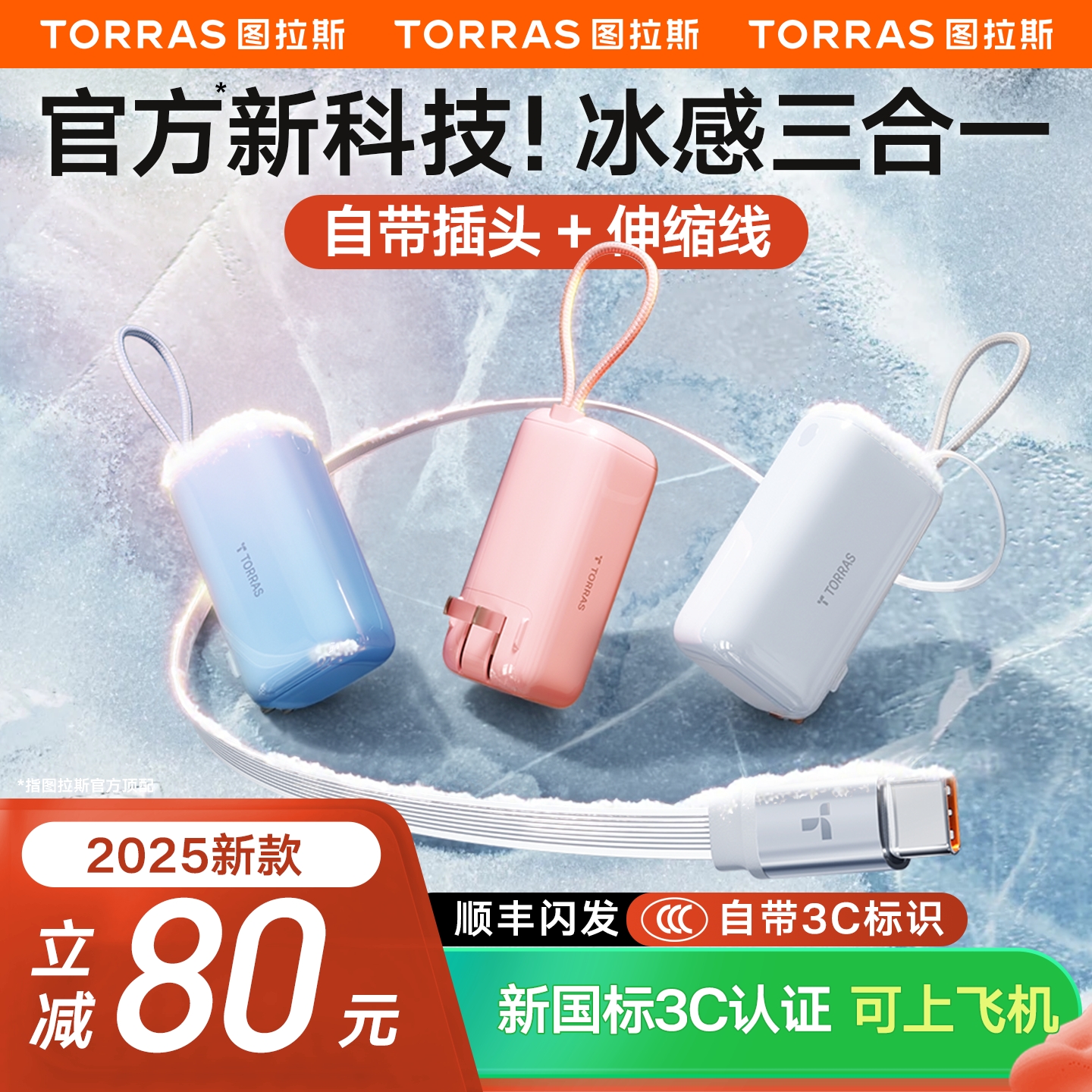 图拉斯自带双线小云宝2025新款充电宝3C认证可上飞机适用苹果17超薄小巧便携快充移动电源官方国标大容量专用