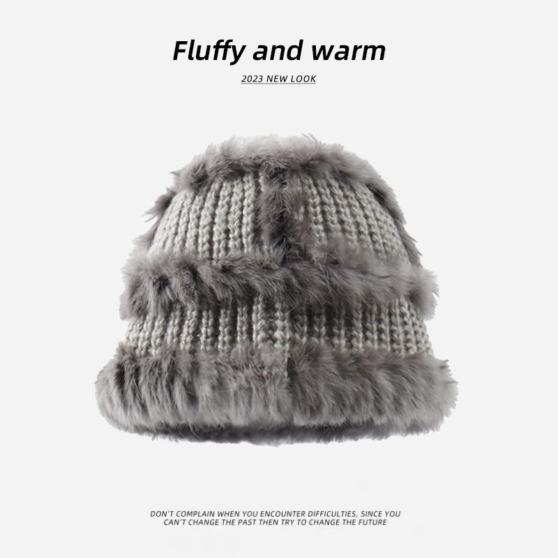 米白兔毛帽子女秋冬显脸小加厚保暖毛绒针织帽大头围毛线渔夫盆帽