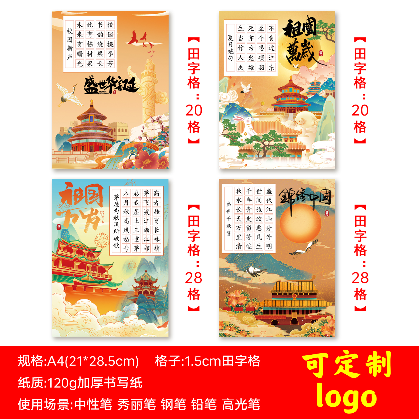 国庆节硬笔书法作品纸红色主题田字格小学生书法参赛专用纸A4加厚