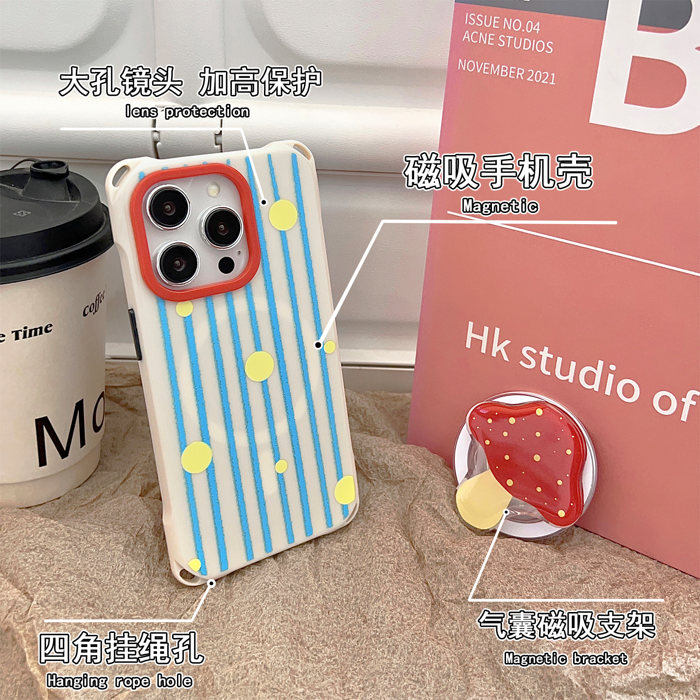 斑点蘑菇磁吸支架手机壳带挂绳适用于苹果17/16Pro四角开孔华为mate70/60Pro手提斜挎vivoX200四角防摔硬壳