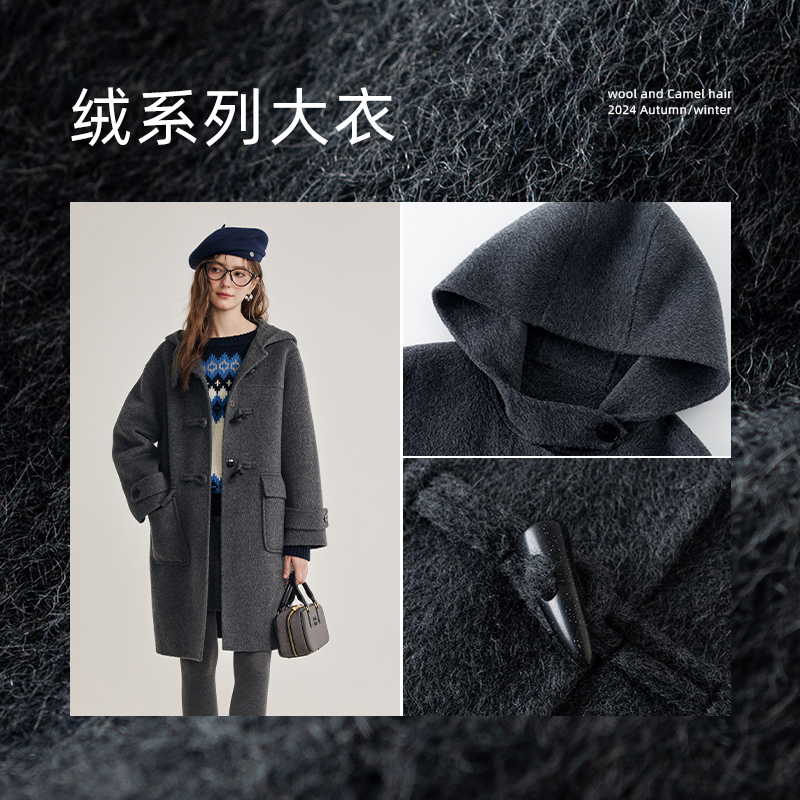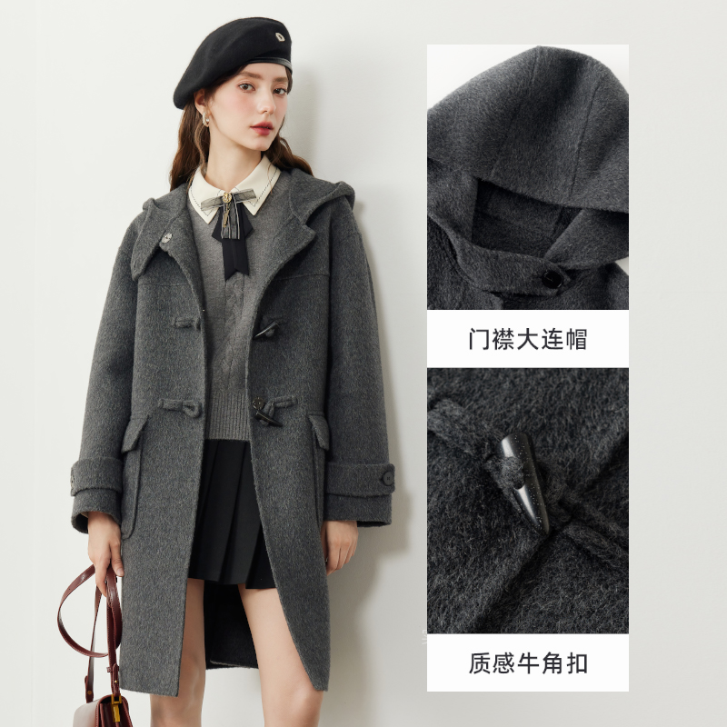 双面羊绒大衣女长款2025年秋冬新款韩系牛角扣连帽直筒羊毛呢外套