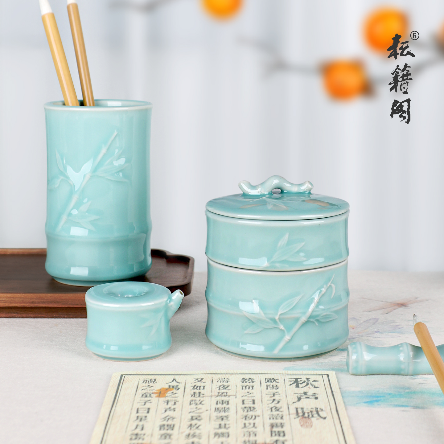 陶瓷火锅砚台书法专用不干墨带盖砚台小学生节节高保湿墨碟毛笔字墨盒文房四宝毛笔墨汁墨海多功能毛笔架砚台