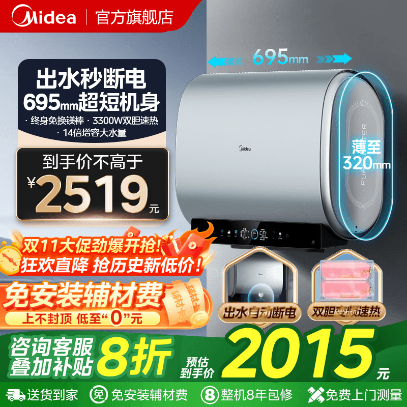 美的电热水器扁桶双胆速热家用洗澡卫生间60升80升大容量UDplus
