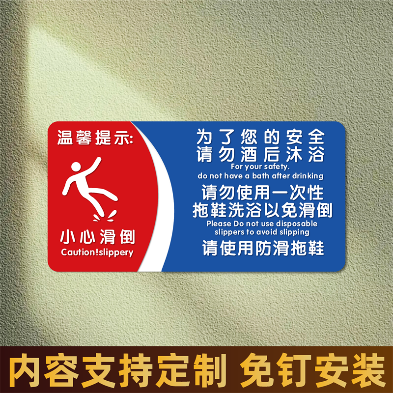 酒店宾馆民宿房间卫生间小心滑倒标识贴酒后沐浴请勿使用一次性拖鞋洗浴以免滑倒请使用防滑拖鞋亚克力提示牌