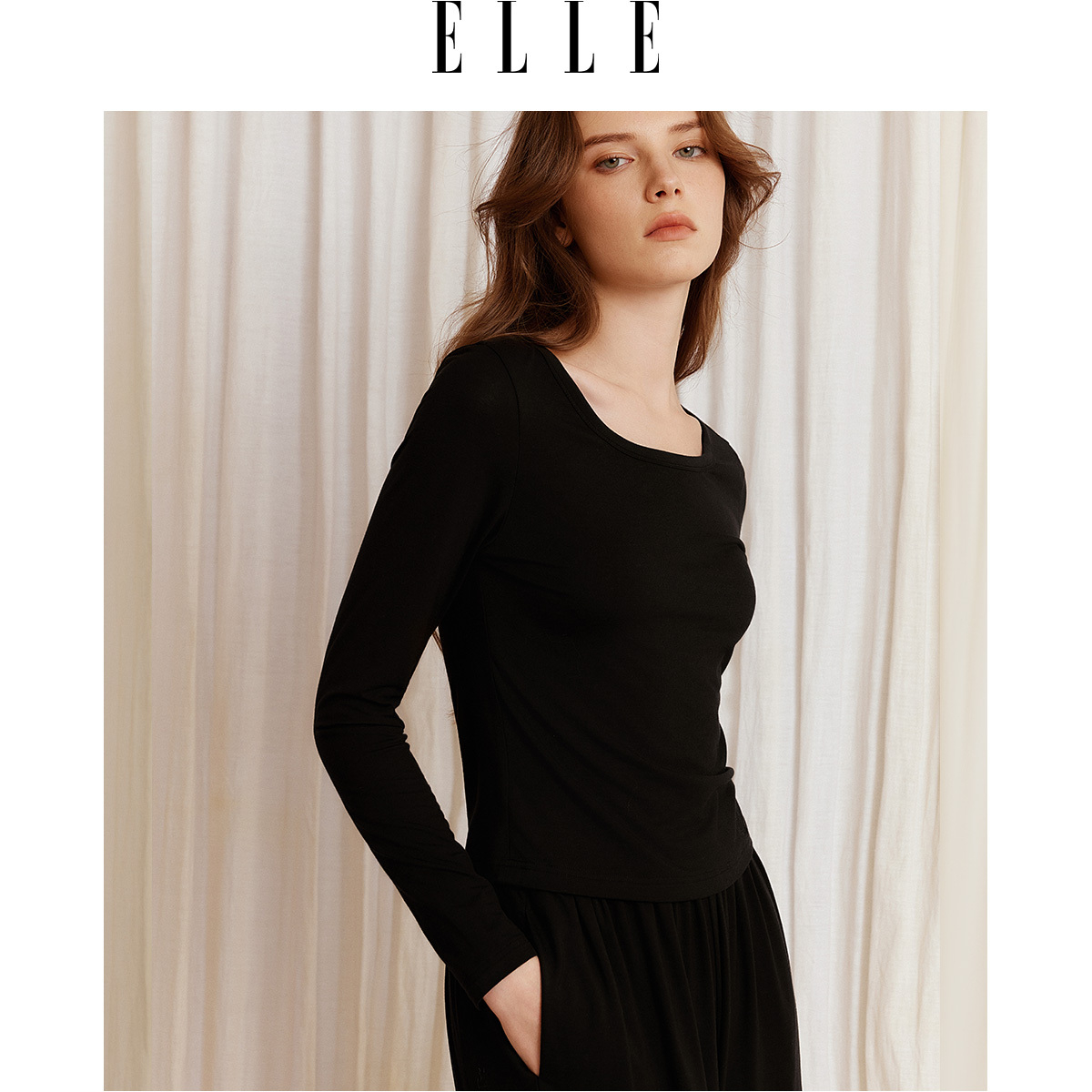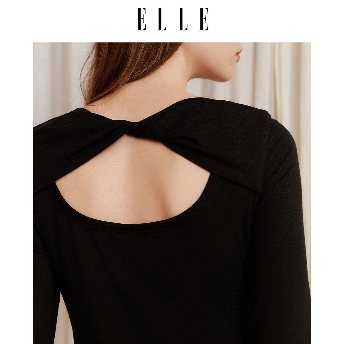 ELLE圆领睡衣上衣女可外穿后交叉时尚镂空设计长袖家居服春季新款