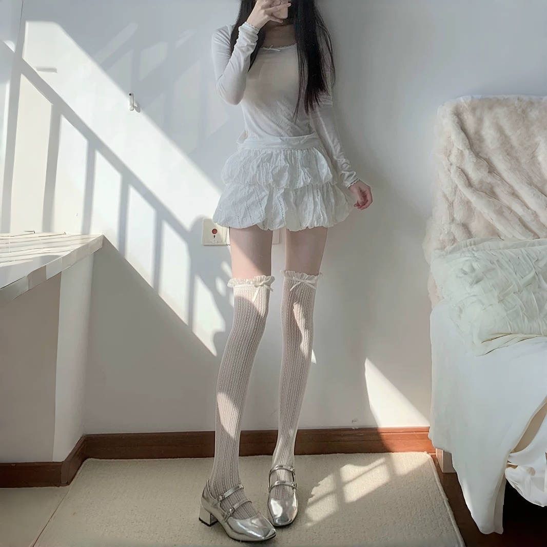 蕾丝花边蝴蝶结过膝丝袜jk镂空日系靴袜高筒洛丽塔春秋季白色长筒