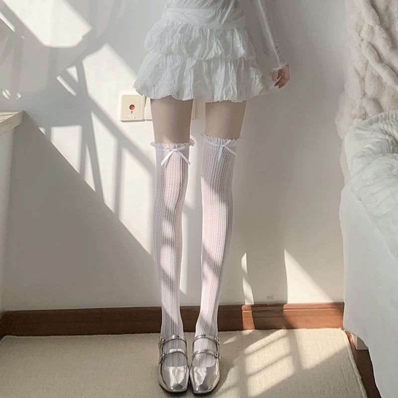 Lolita白色过膝袜夏季薄款天鹅绒高筒大腿袜纯欲花边蝴蝶结长筒袜