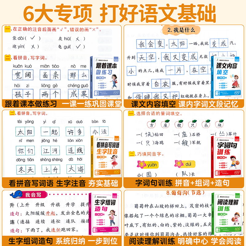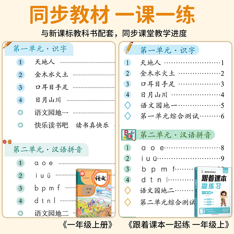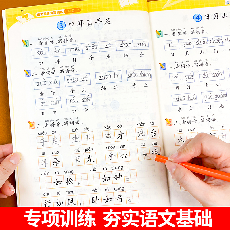 跟着语文课本学 小学语文阅读理解专项训练书每日一练一二年级上册看拼音写词语字词句天天练人教版同步生字组词造句一课一练