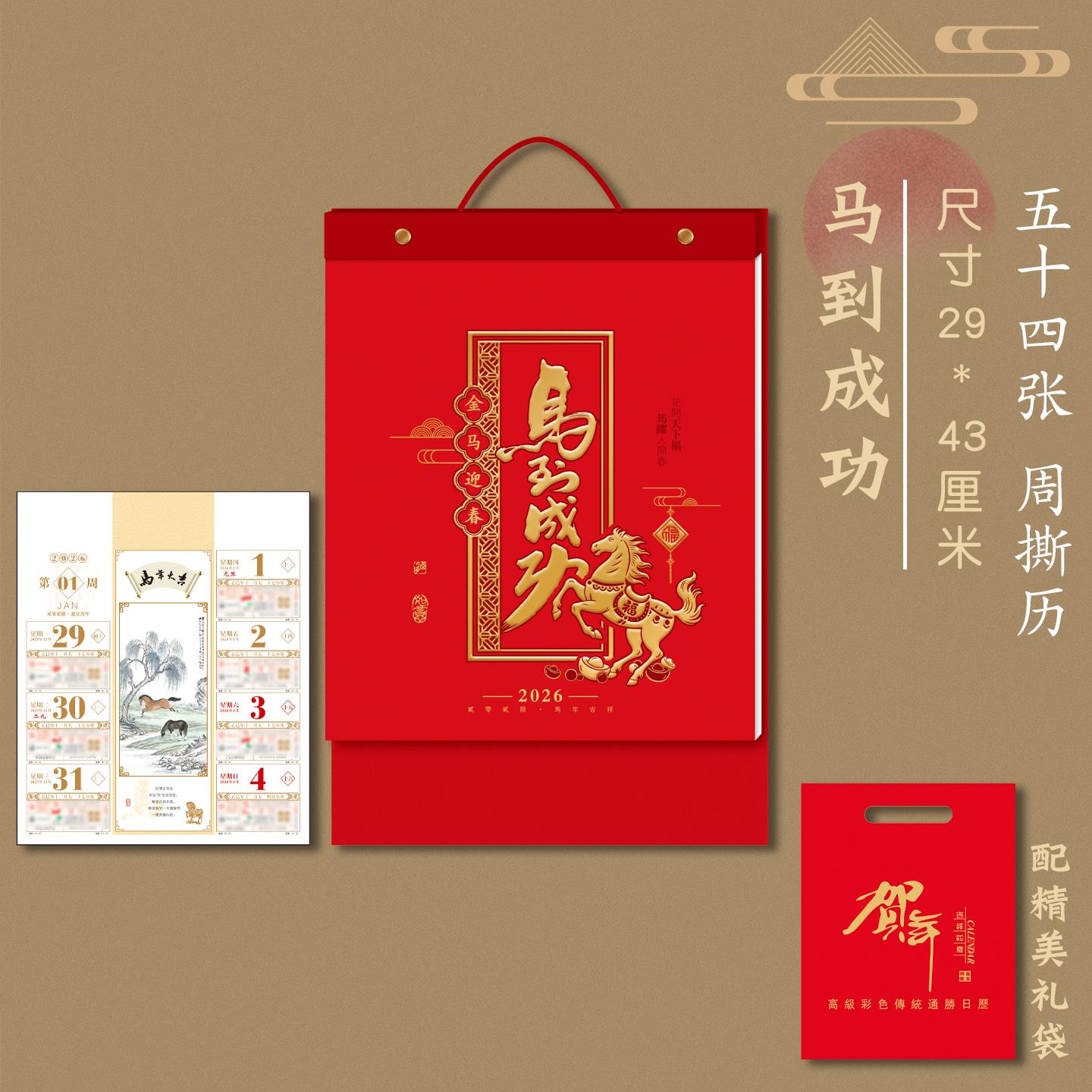2026年日历一周一张家用挂墙周历手撕历老皇历新款黄历农历马年福字挂历公司客户新年礼品广告定制定做