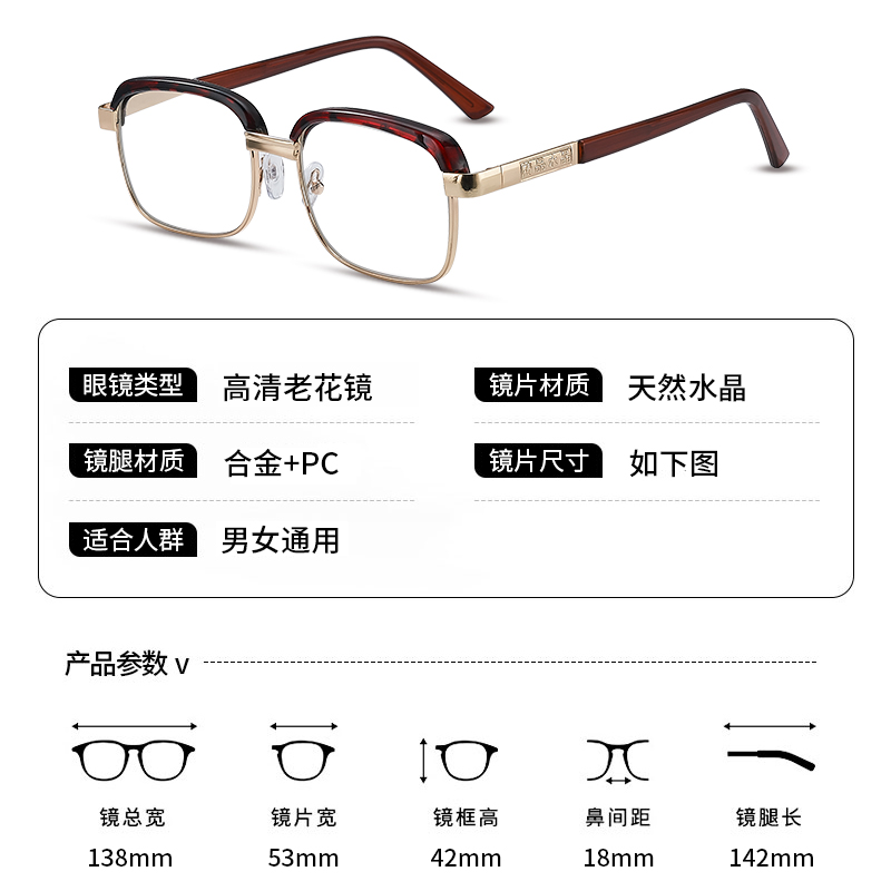 正品东海水晶高清眼镜舒适老光爆款高档老花镜女款红框年龄100度