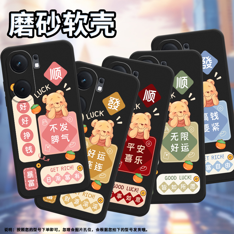 适用iQOONeo9sPro手机壳iQOOZ9Turbo+保护壳5G全包边磨砂壳好运连连日渐富有高级感挂绳柿子托腮的小熊好好挣