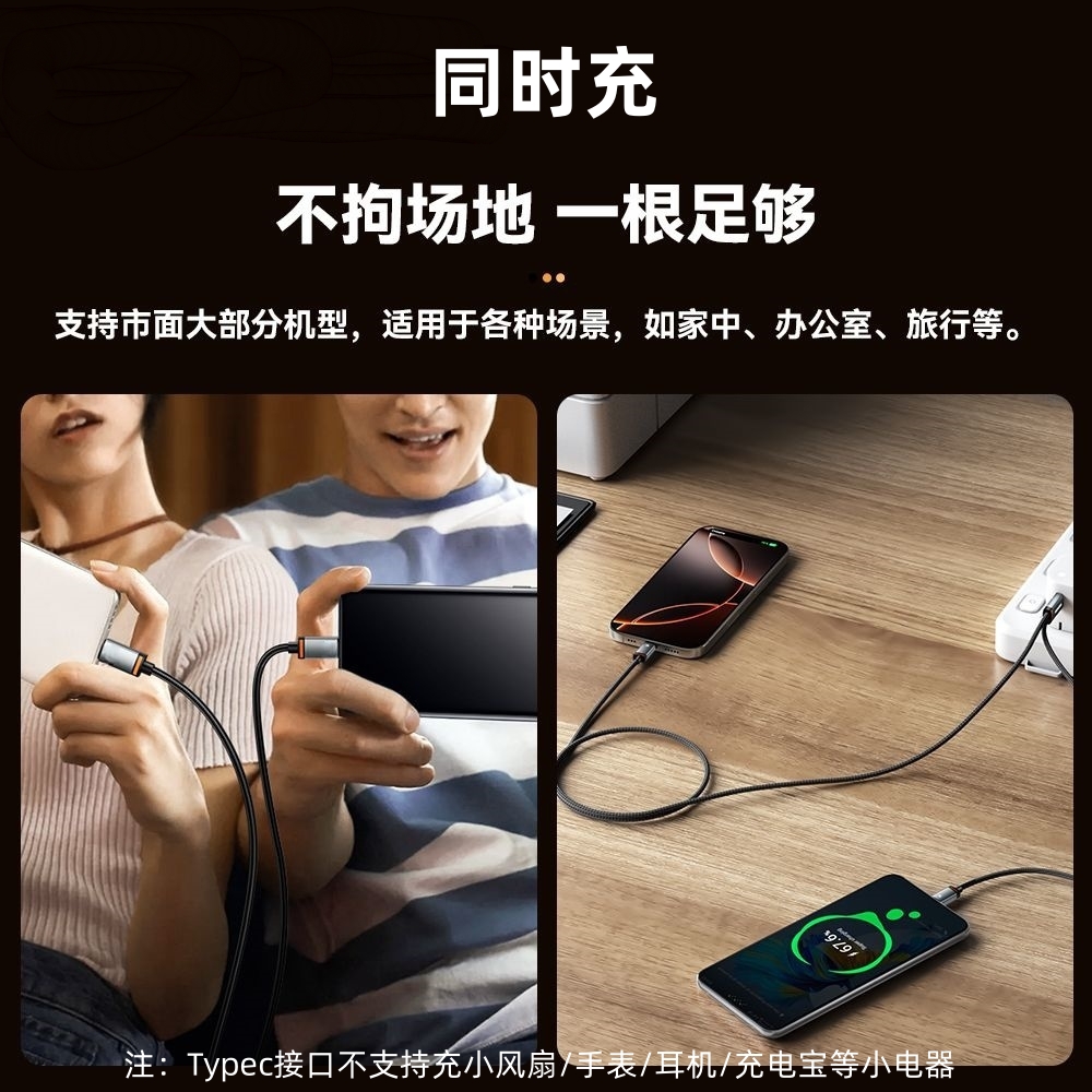 倍思数据线三合一充电线器66W手机快充一拖三6A适用苹果17华为安卓typec三头mate60Pro车载iPhone16多功能5A