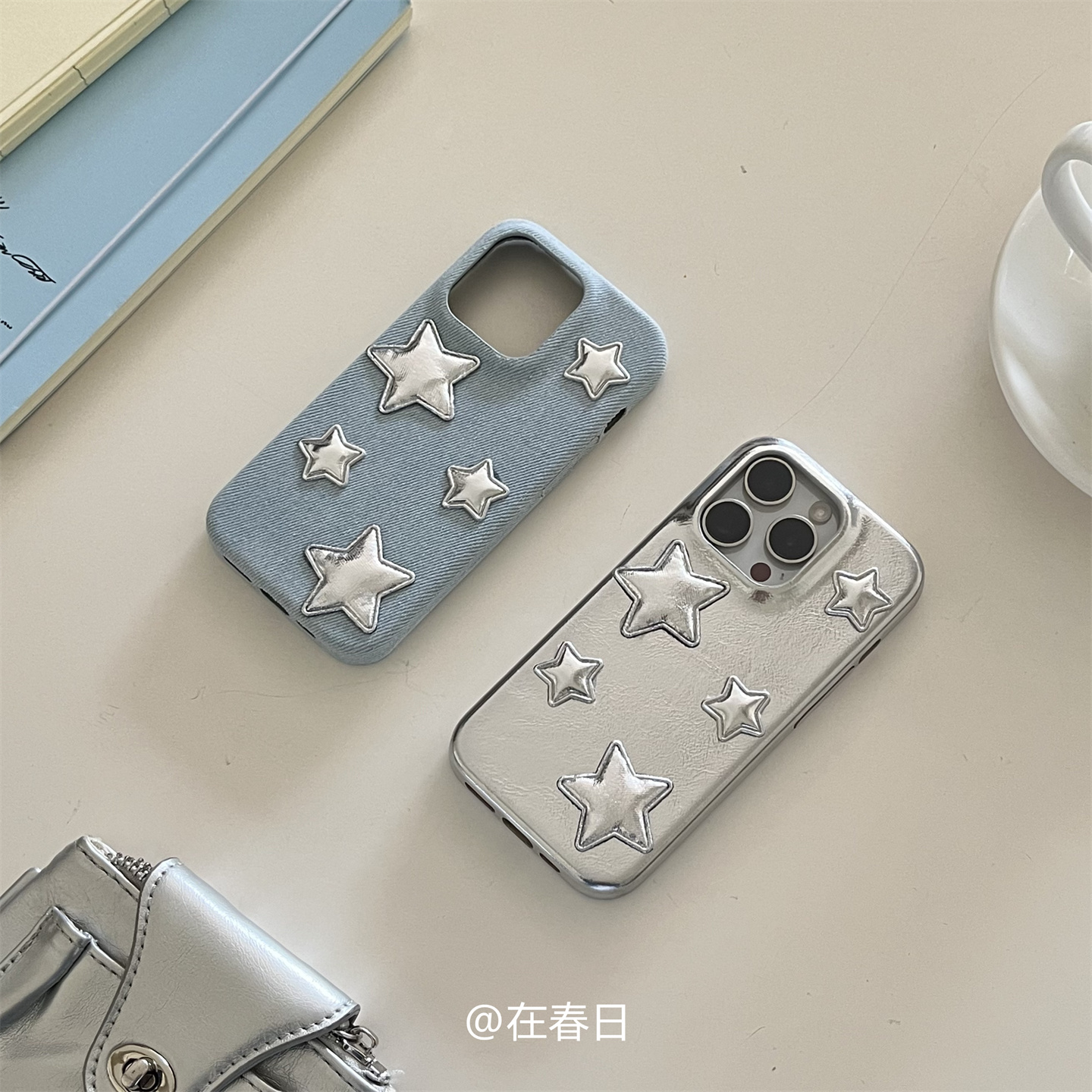 在春日韩系ins时髦皮质银色星星手机壳适用iPhone17promax硬壳16promax全包15pro保护壳14防摔