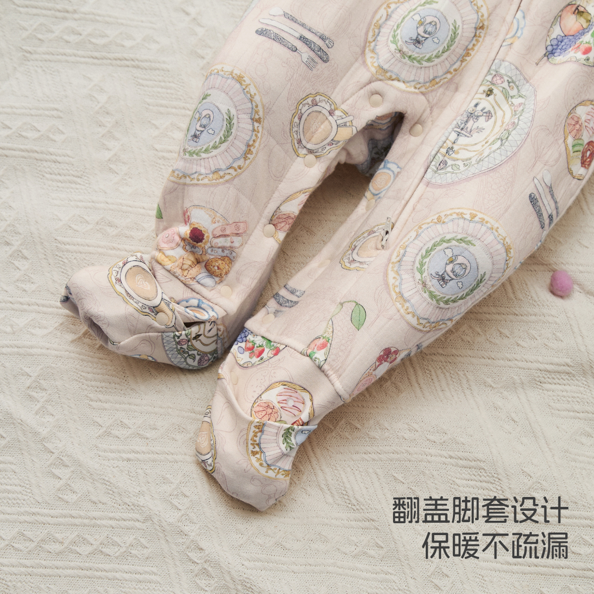 小猪大卫新生儿秋季保暖连体衣男女宝宝卡通印花中开夹棉爬服