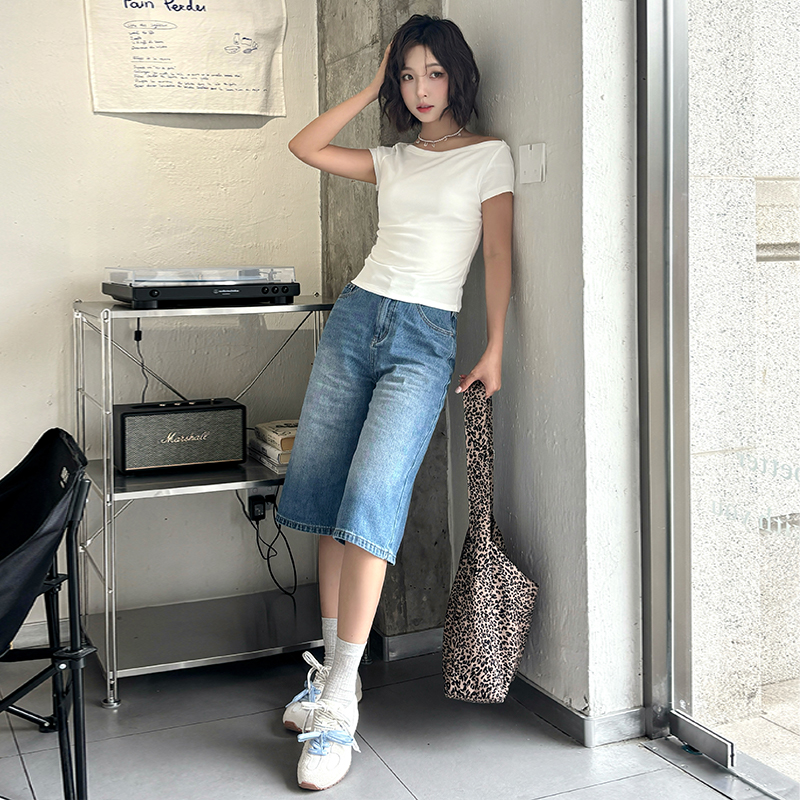 荒荒家 露肩短袖2025夏季新款斜肩设计小心机修身纯欲ins风T恤女