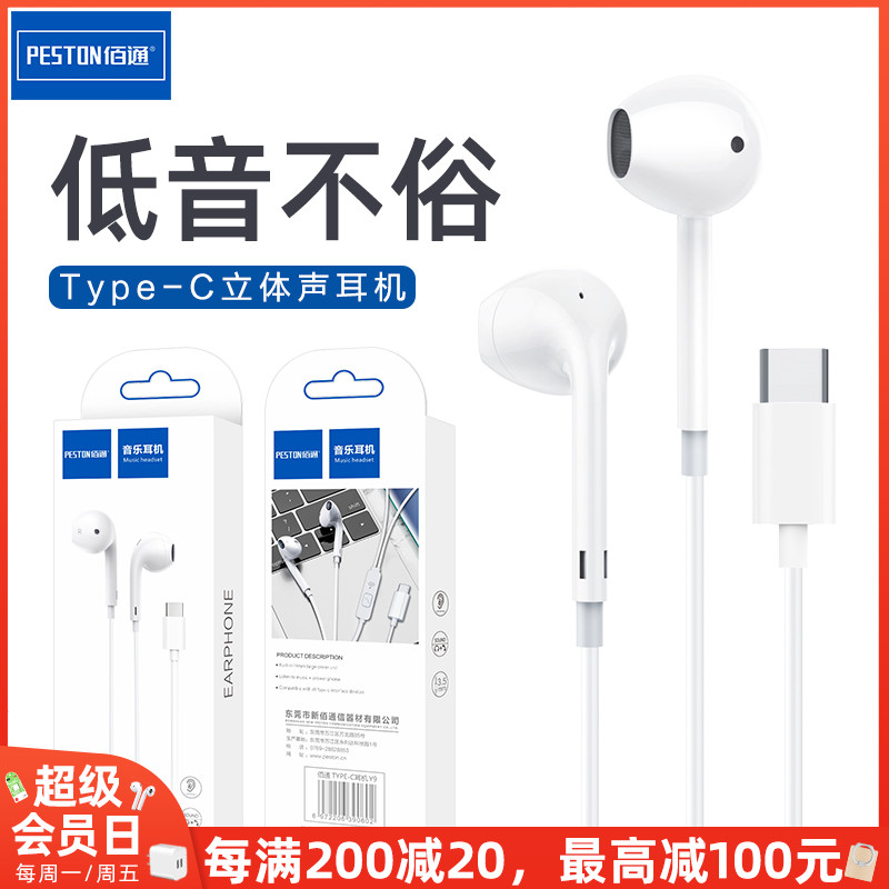 佰通Y9立体声Type-C有线耳机入耳适用于P40铜环线控手机耳塞批发
