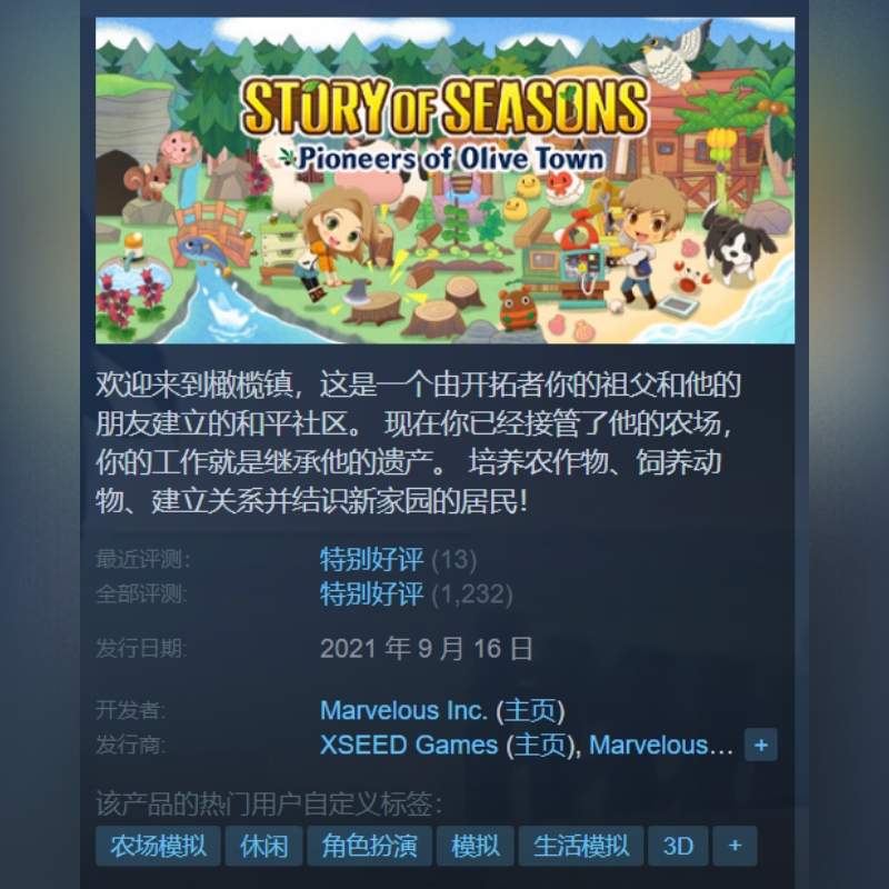 Steam正版 牧场物语橄榄镇与希望的大地 STORY OF SEASONS 激活码