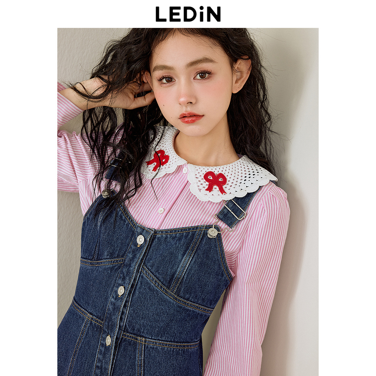 乐町背带牛仔裙年春新款后背镂空单排扣设计感深牛仔蓝连衣裙