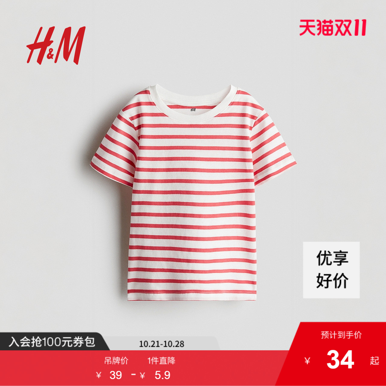 HM童装儿童男童T恤时尚洋气条纹圆领短袖直筒下摆柔软上衣0611
