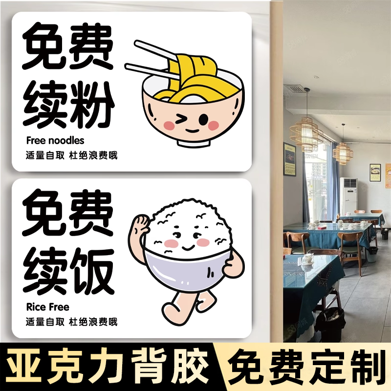 免费加饭粘贴牌米饭加面续粉提示牌自助加汤K不收费PVC不干胶贴纸