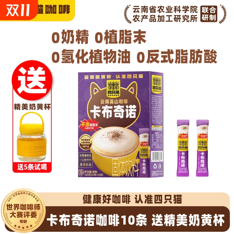四只猫 0植脂末新款四口味拿铁特浓卡布三合一速溶咖啡送小奶杯