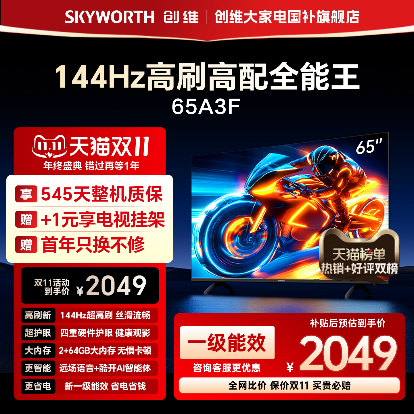 创维电视65A3F 65英寸 144Hz高刷智能语音液晶电视机以