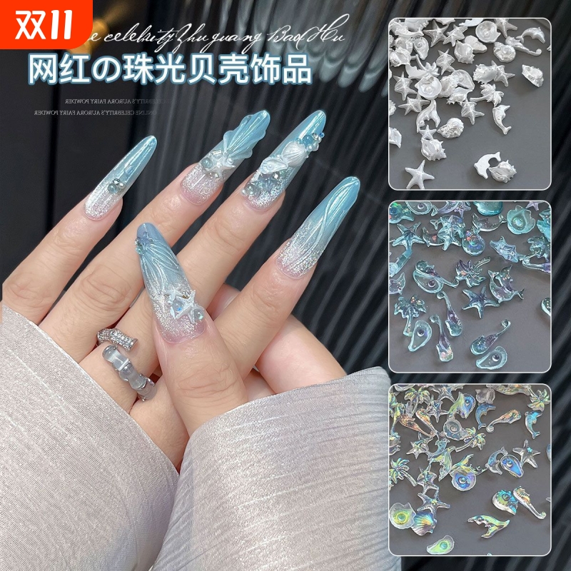 网红珠光贝壳美甲饰品冰透极光海洋系列混装海星扇贝树脂指甲装饰