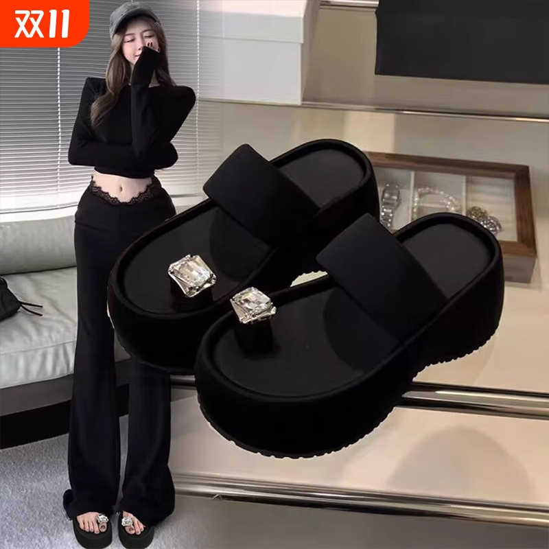 网红同款厚底增高拖鞋女夏外穿小个子7CM水钻套趾沙滩一字凉拖鞋