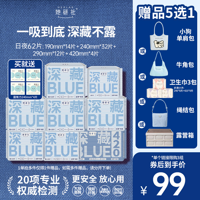 【赠品可选】她研社卫生巾深藏BLUE姨妈巾轻透防漏量大任选组合