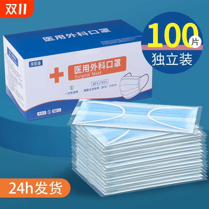 康明雅医用外科口罩一次性三层防护疗独立包装100只粉尘成人大人