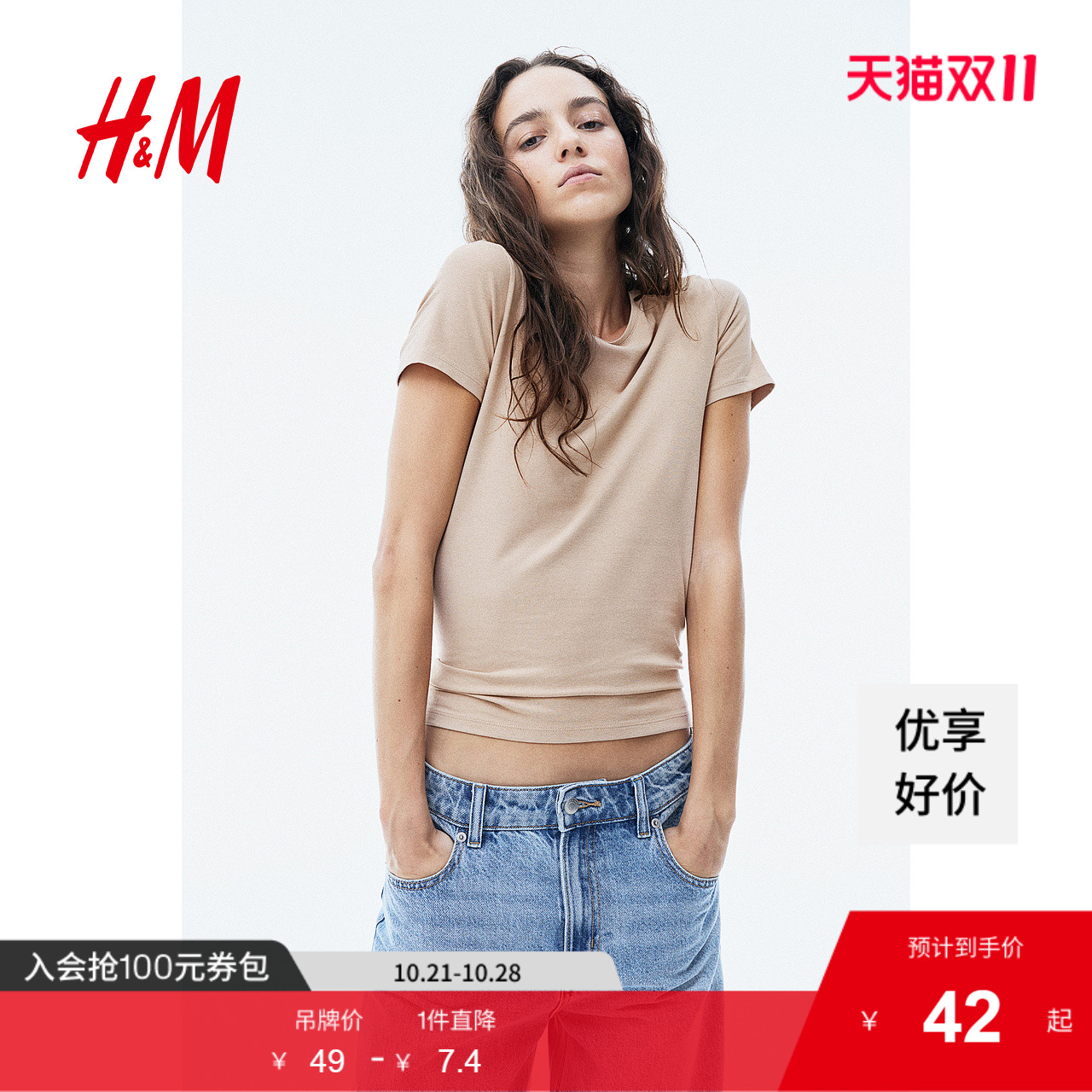 HM女装T恤2025秋季新款洋气浅秋季系圆领简约修身短袖上衣12