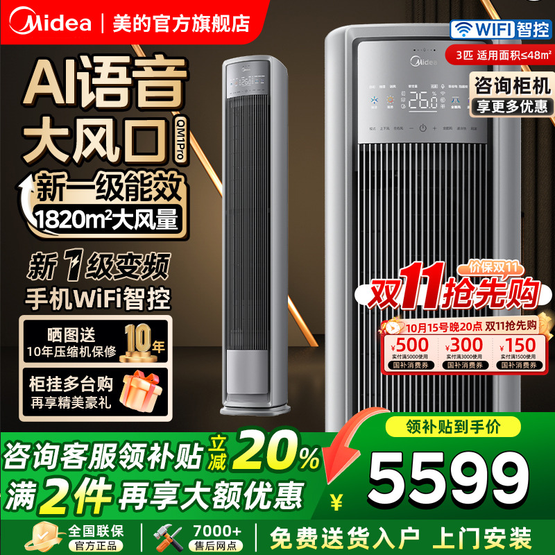 美的空调3匹一级全面风柜机立式家用客厅变频冷暖官方旗舰店新品