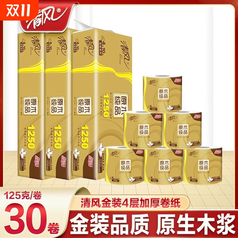 清风卷纸4层30卷125g卫生纸巾厕纸家用实惠装有芯原木原生木浆