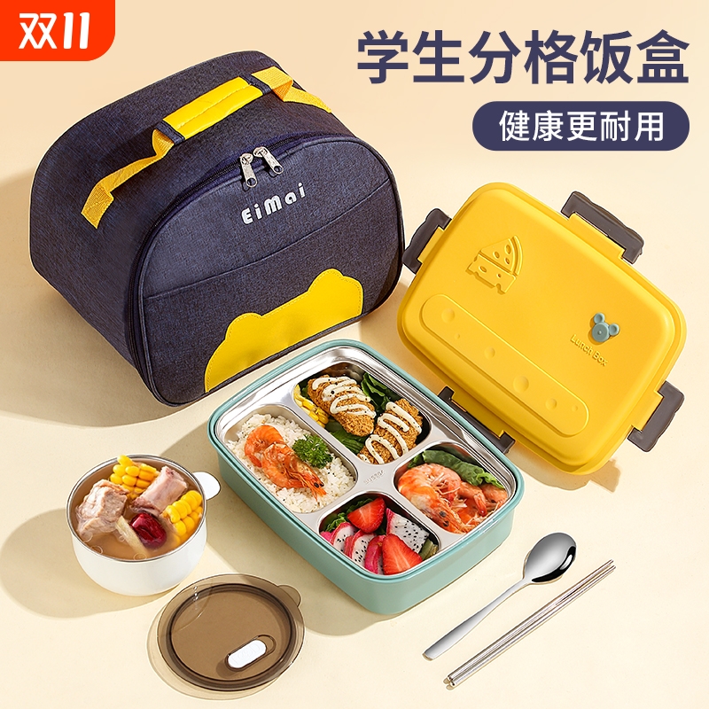 不锈钢快餐盒家用餐盘食堂汤饭盘加厚加深分格饭盒带盖长方形四格
