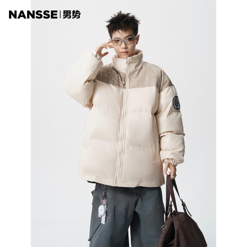 美式拼接撞色PU皮高领棉服男生冬