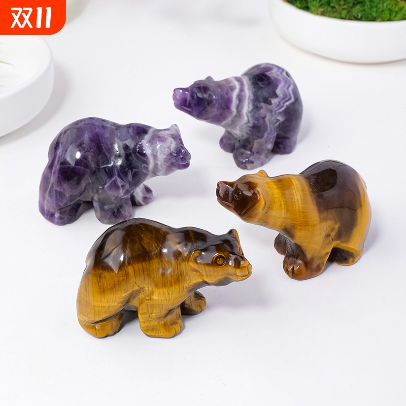 天然水晶北极熊雕刻件虎眼石紫水晶动物狗熊家居办公摆件