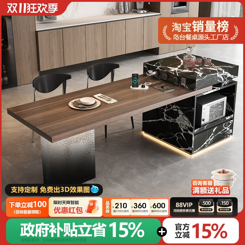 可定制意式轻奢岛台餐桌一体家用可伸缩岩板开放式厨房高级感导台