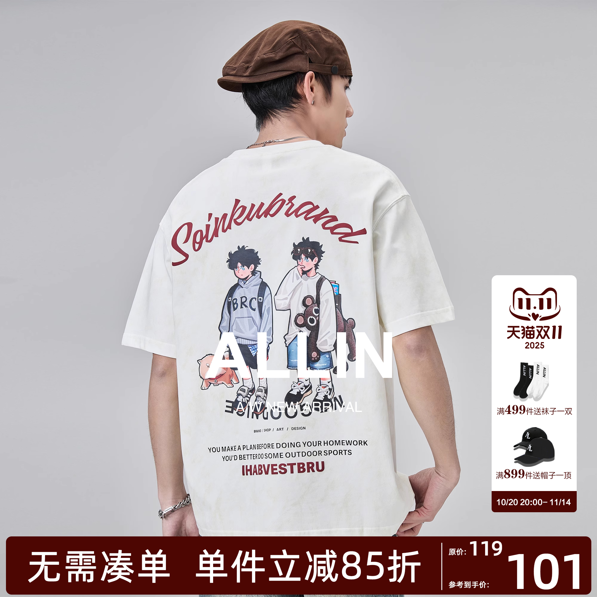 ALLIN 白色短袖t恤男夏季美式潮牌后背卡通印花宽松圆领重磅上