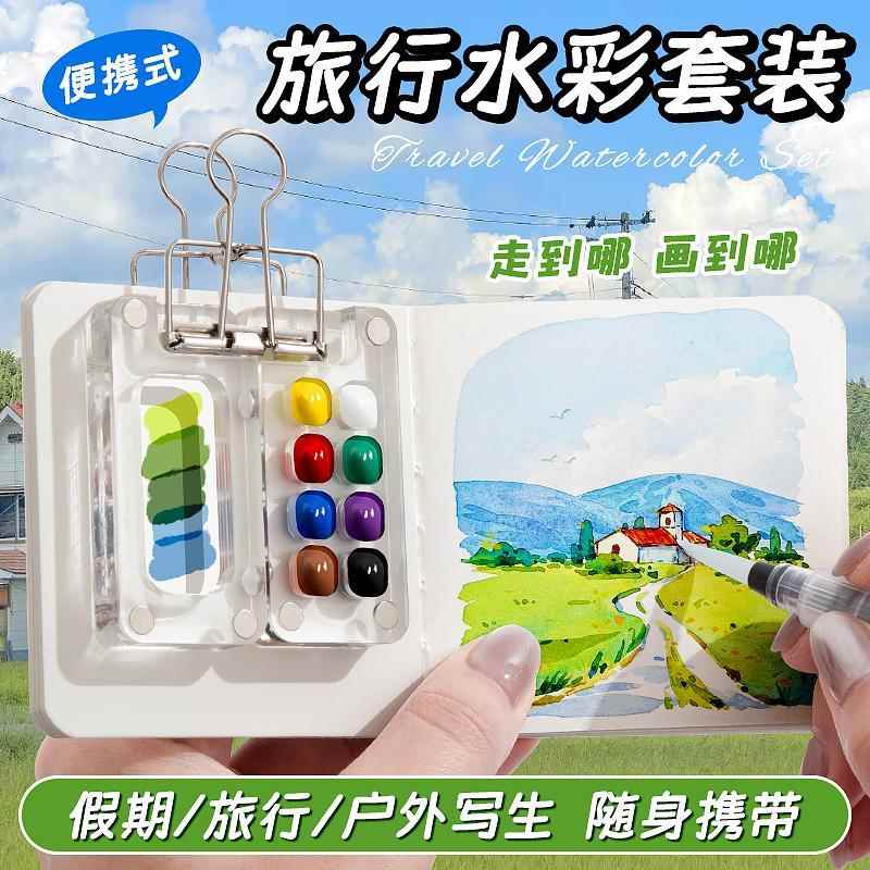 迷你水彩颜料盒亚克力装随身便携手账本旅行绘画本调色小画板套装