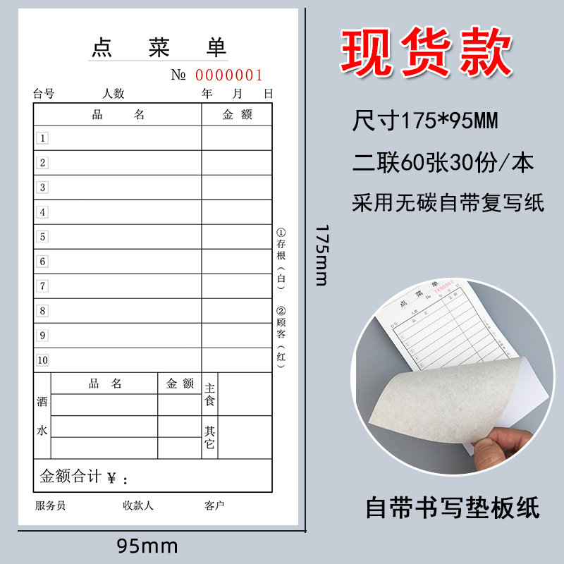 点菜单二联无碳自带复写r纸酒楼饭店点餐单加菜下菜单酒水单据定