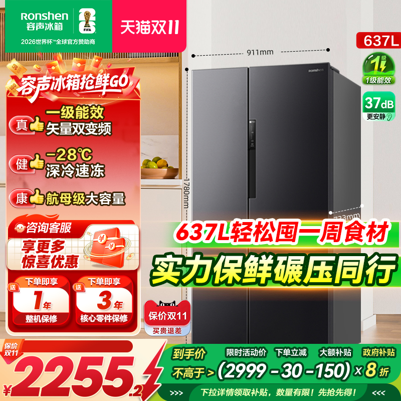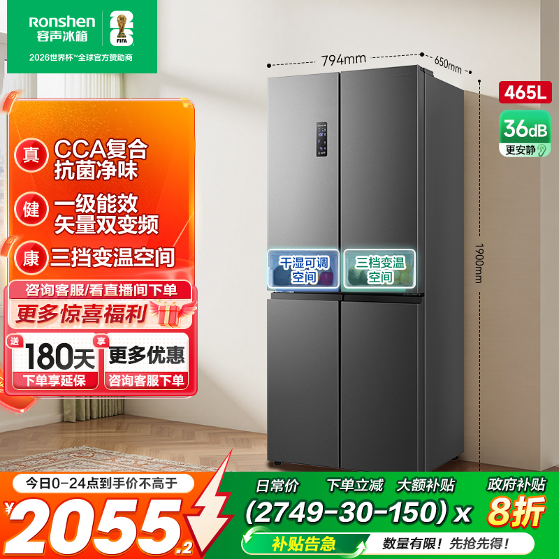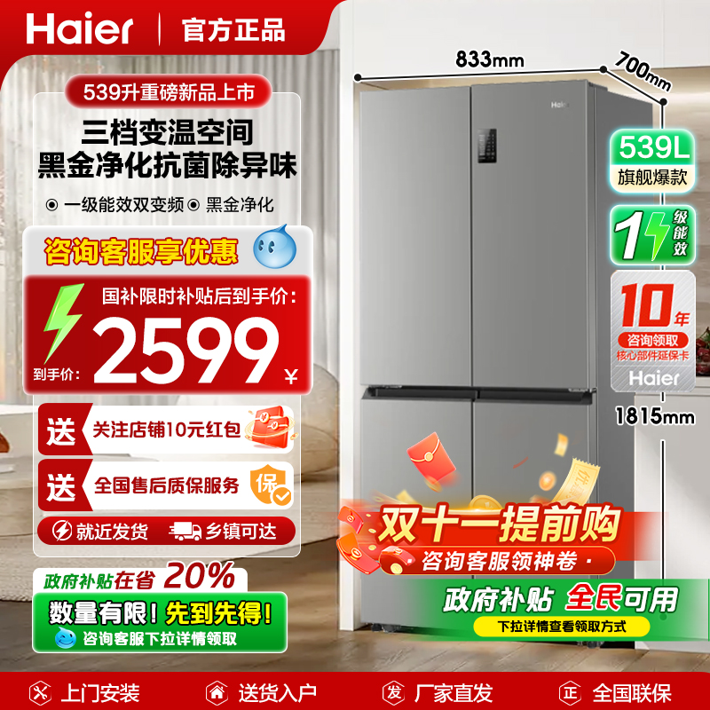 [换新补贴]海尔659L十字双对开四门一级能效大容量家用无霜电冰