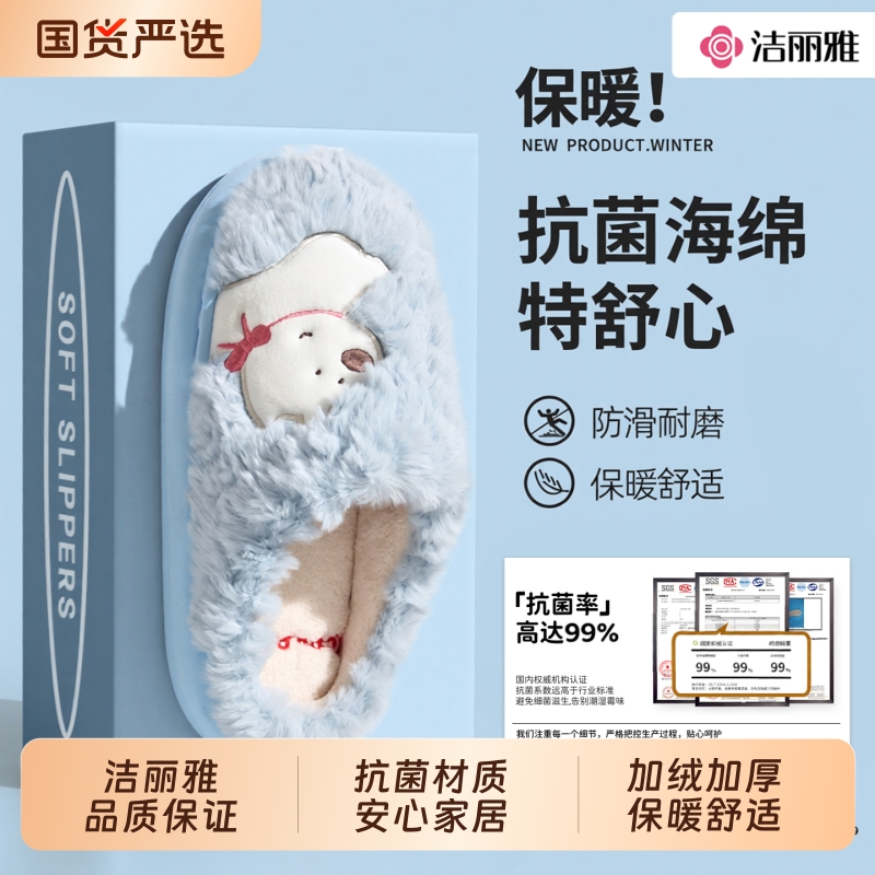 洁丽雅棉拖鞋女冬季可爱厚底卡通室内居家毛毛情侣包头拖鞋男秋冬