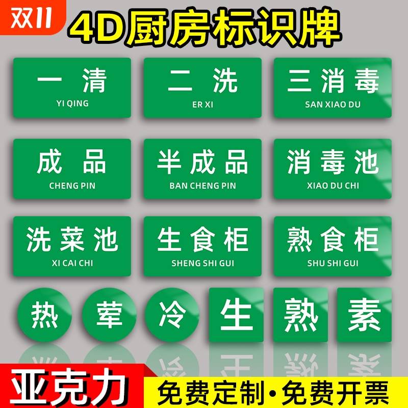 厨房亚克力标识牌一清二洗三消毒标示贴成品半成品已消毒洗菜洗肉清洗