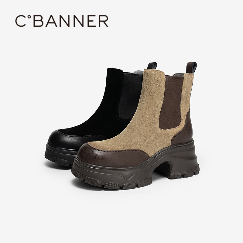 千百度厚底拼接切尔西靴女2025冬季新款增高烟筒靴保暖粗跟短靴子