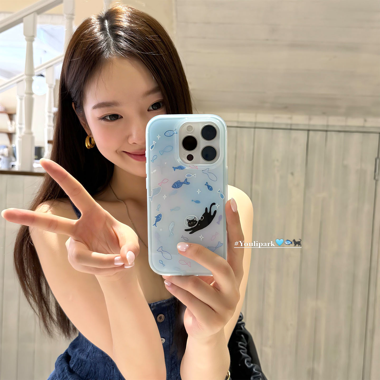 清新蓝色晕染黑猫小鱼苹果手机壳
