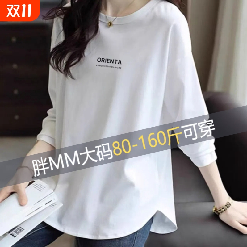 纯棉小众弧形长袖t恤白色中长款女士春秋新款宽松显瘦大码打底衫A