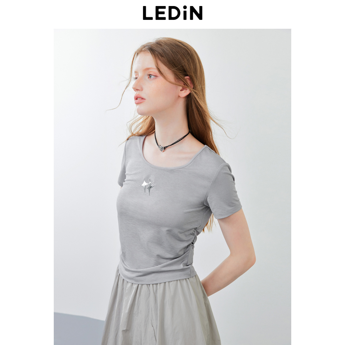 乐町韩系机能星星图案短袖T恤夏季腰间抽褶设计正肩上衣