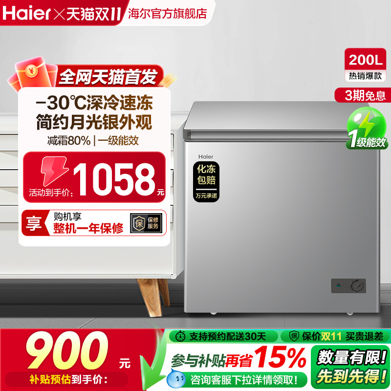 【新品】海尔200升商用小型家用冰箱一级冷藏深冷减霜节能冷柜